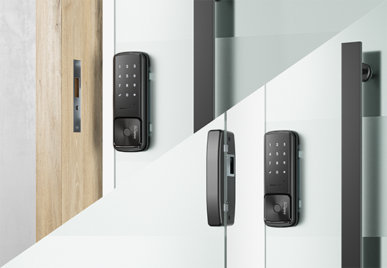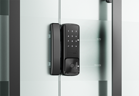 MFR 4000, fechadura inteligente de sobrepor para portas de vidro, permite até 100 biometrias, 15 senhas e acesso pelo App Mibo Smart.