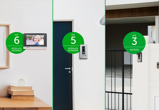 Use até 6 módulos internos (telas) e 5 externos e tenha controle de até 3 acessos: internos ou externos.