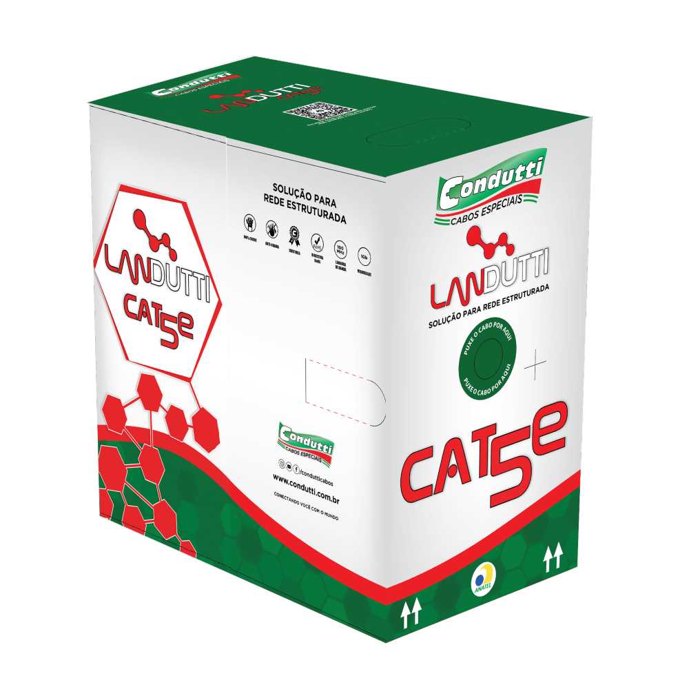 Cabo de Rede U-UTP Cat5e é fabricado com condutores 100%COBRE, isolados em polietileno especial e torcidos dentro dos padrões normativos EIA/TIA 568B.2 o que garante a máxima qualidade para transmissão de dados nas aplicações